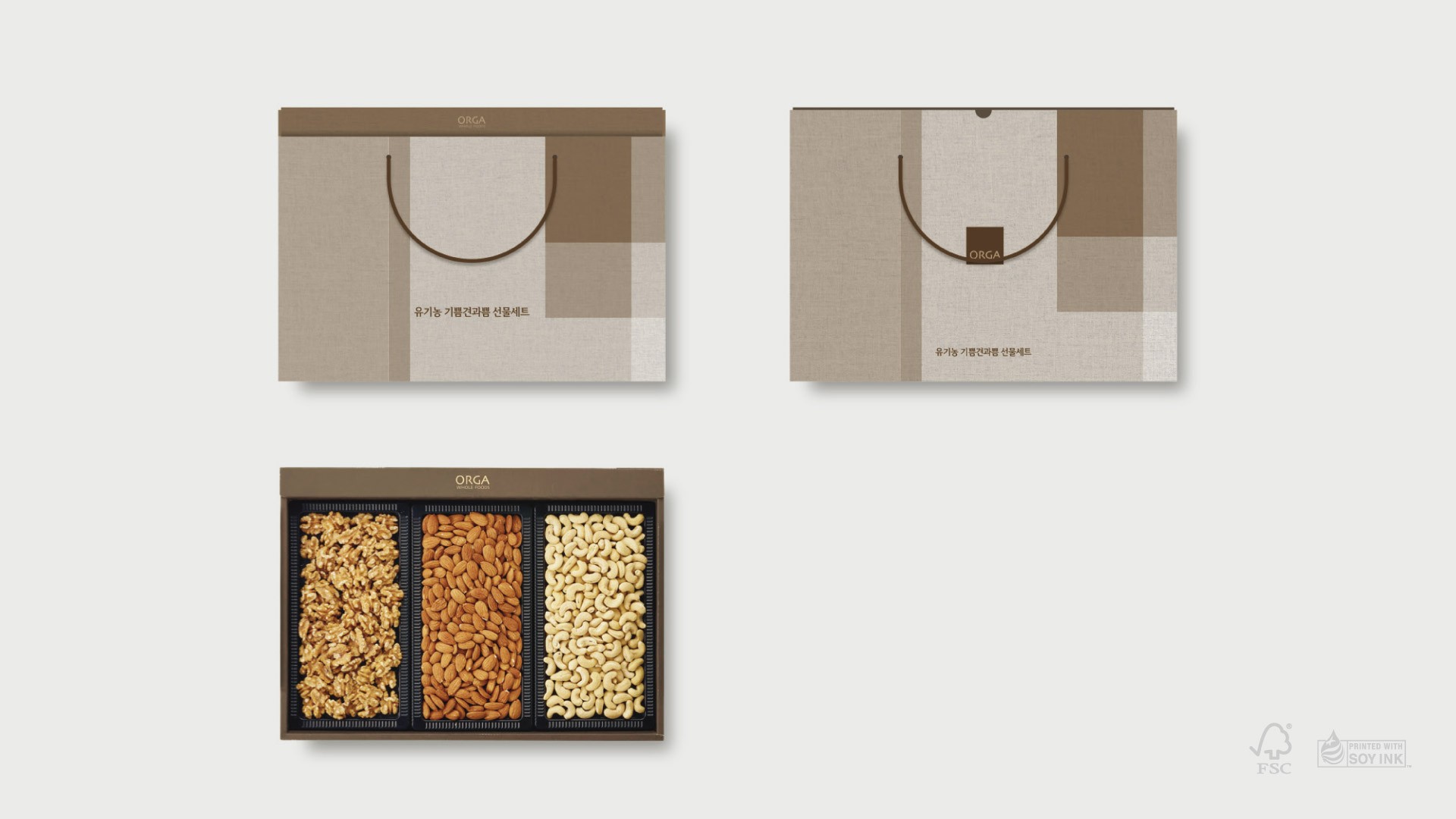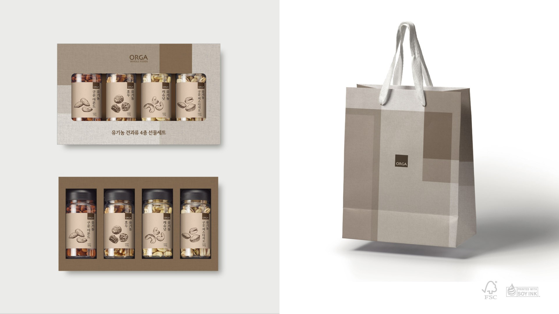 친환경 브랜딩이 표면적 이미지에 머무는 경우가 많은 시장에서, 올가는 브랜드 철학의 무게를 온전히 담아낼 패키징이 필요했습니다. 프리미엄 패키징 방향성과 친환경 소재를 조사하고 스케치와 프로토타입을 통해 사용성을 검증해, 최소 코팅 재생지와 콩기름 잉크를 적용하고 재사용 멀티백을 개발해 브랜드 철학과 웰니스 가치를 일관되게 시각화한 브랜드 경험을 완성했습니다.